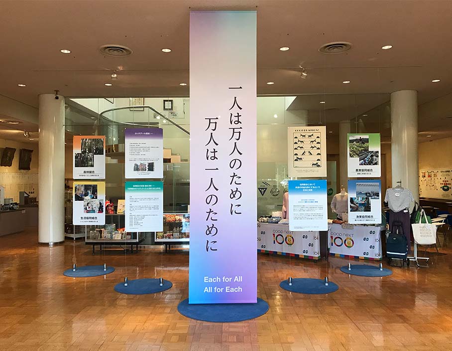 コープこうべ誕生の歴史、思想と理念、阪神・淡路大震災生協資料事業とさまざまな活動の歴史をパネルや写真で展示。