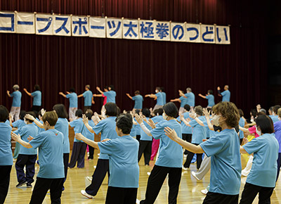 店舗の組合員集会室や地域の施設を会場に、組合員同士で楽しむコープスポーツ。卓球やテニス、ヨーガ、太極拳、エアロビクス、子どものサッカー&野球などのグループがあります。